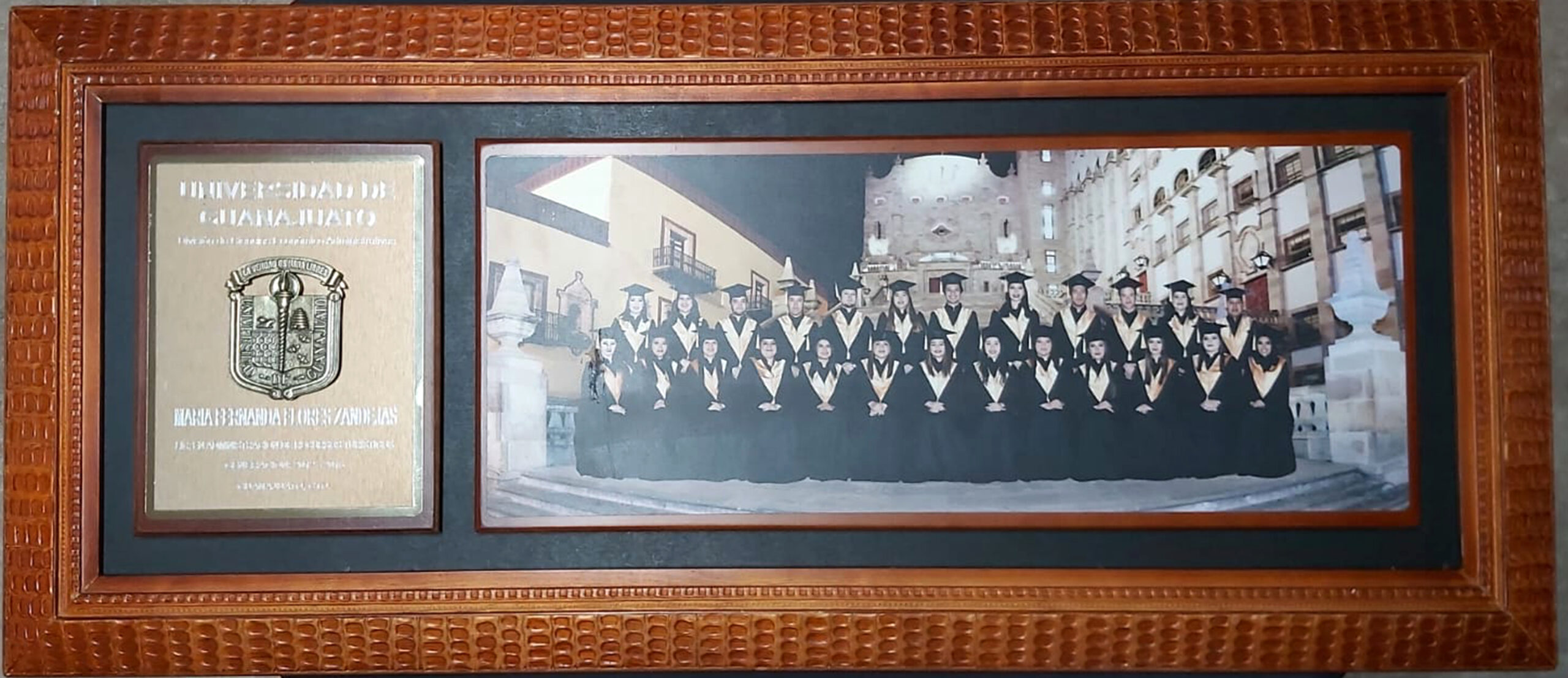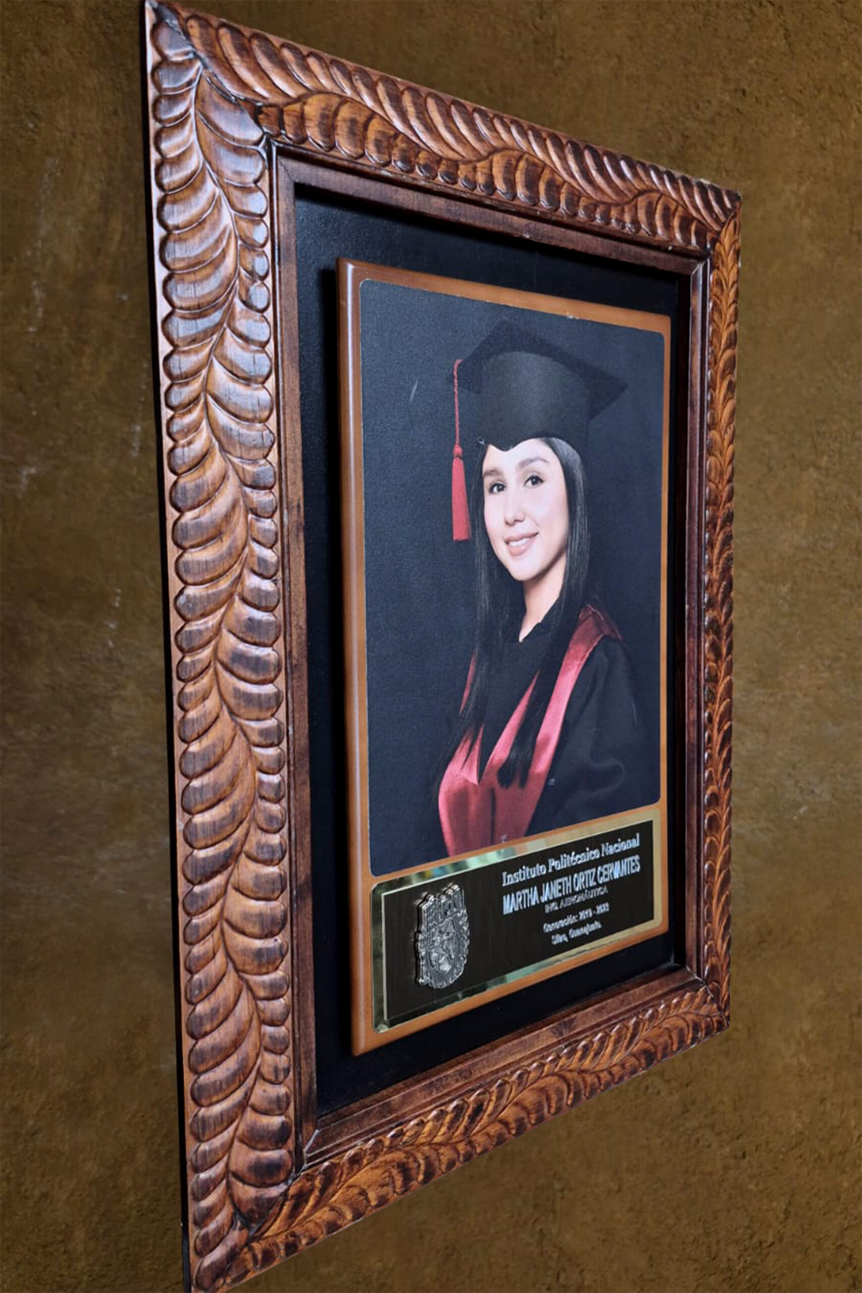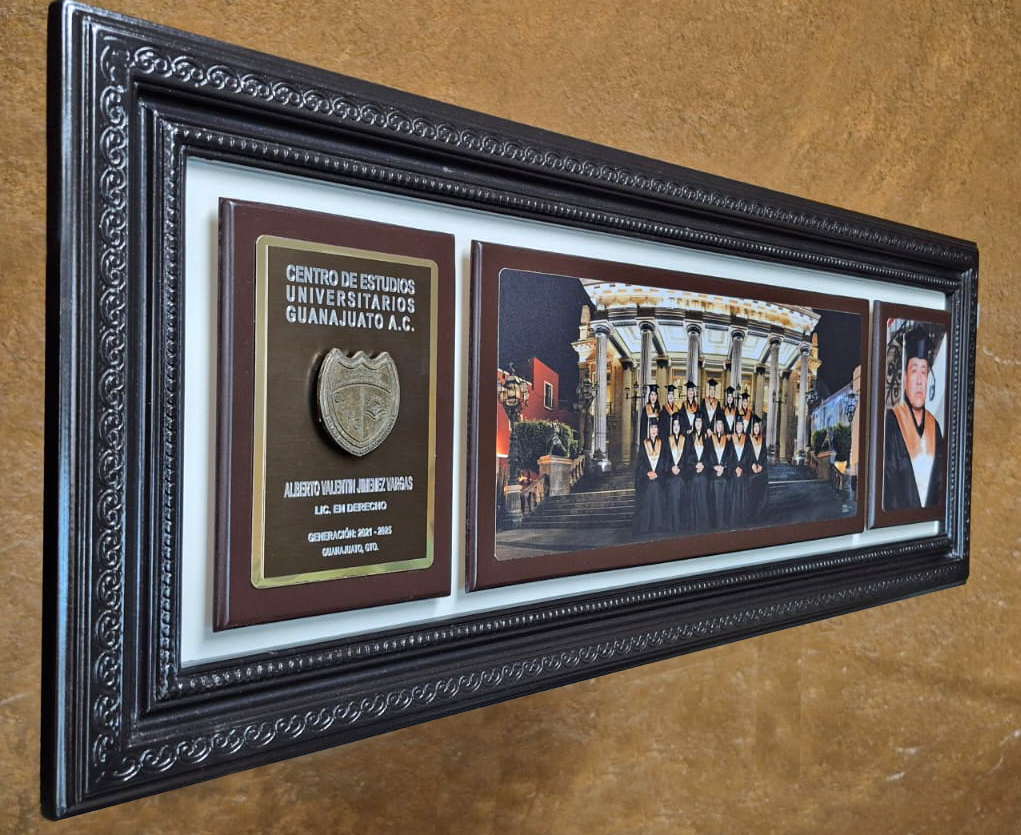 Marco de madera de pino o Poliestireno, con placa de aluminio gravada a punta diamante, fotografías con tratado plastificado para protección de Rayos UV